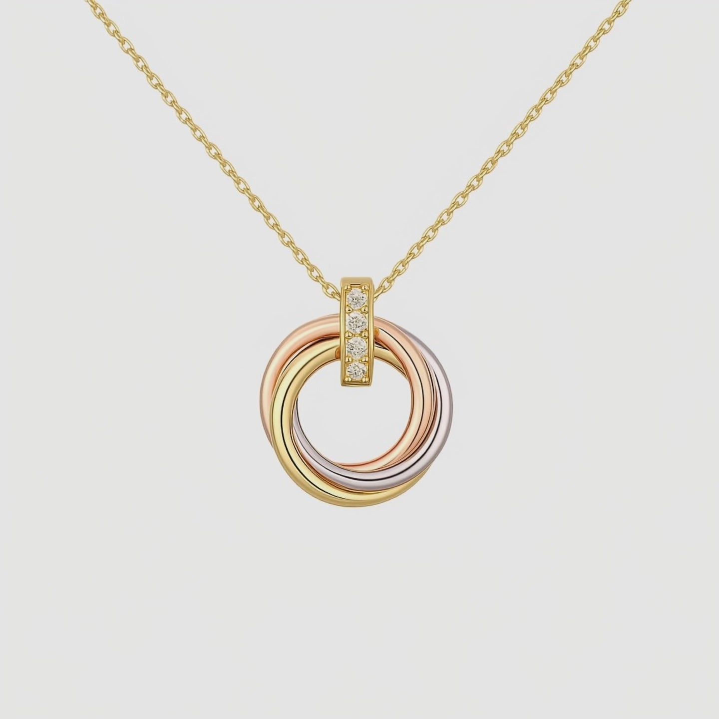 Sarı altın, rose gold ve beyaz altının kusursuz uyumuyla tasarlanan Trinity Circle Kolye, birlik ve zarafetin sembolüdür. İç içe geçen üç halka, hayatın dengesini ve sonsuzluğu simgelerken, taş süslemeli detay tasarıma sofistike bir ışıltı katar. Günlük stilinize modern bir zarafet katarken özel anlarda da şık bir tamamlayıcı olur.