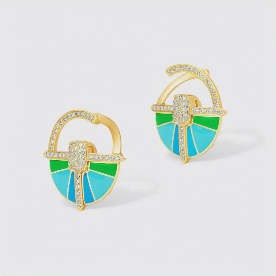 Yeşilden turkuaza uzanan canlı tonlar, altın hatlarla birleşerek okyanusun tazeliğini ve sahil rüzgarının hafifliğini yansıtır. Parlak taşlarla süslenen kıvrımlı form, her harekette ışığı yakalayarak görünümüne ışıltılı bir vurgu katar.