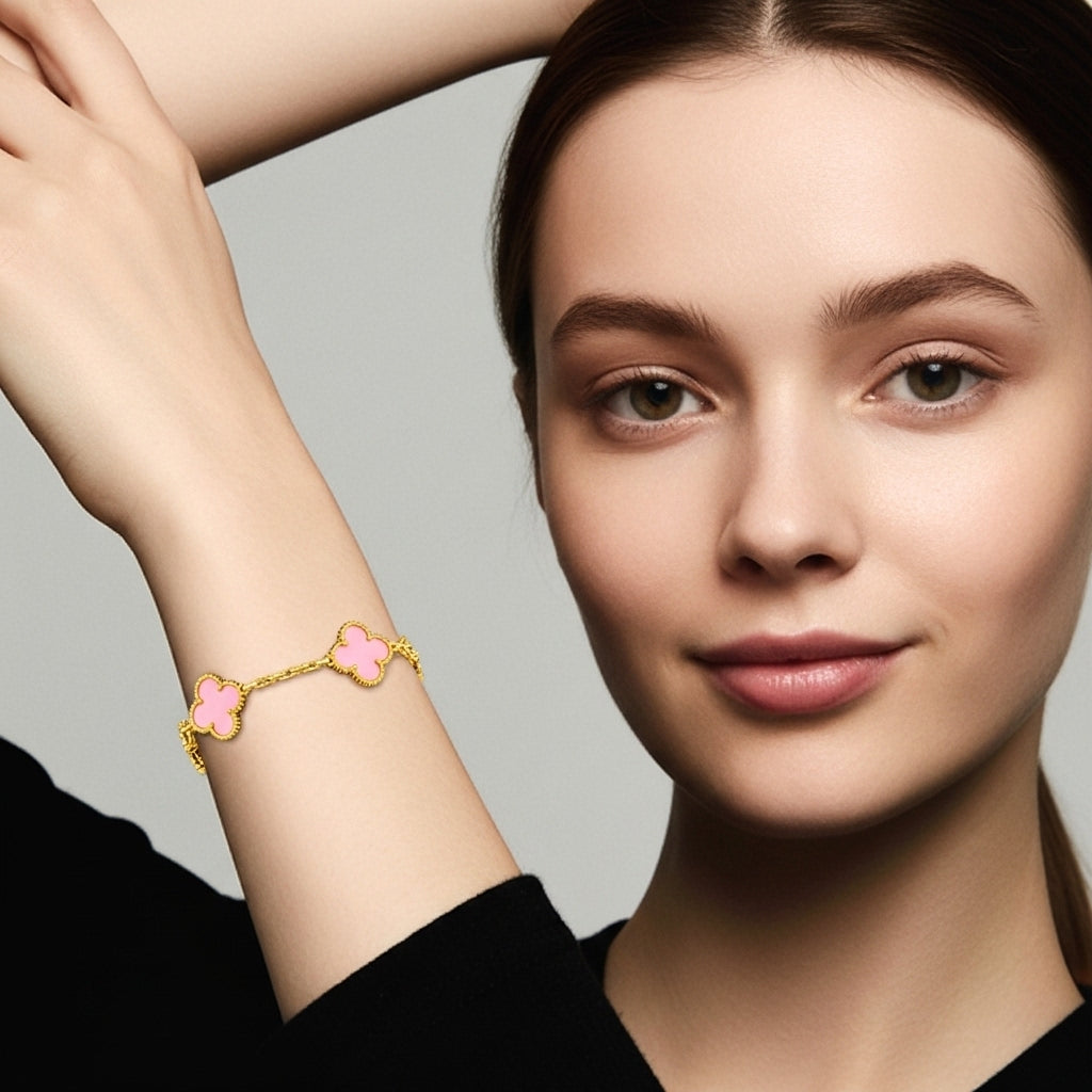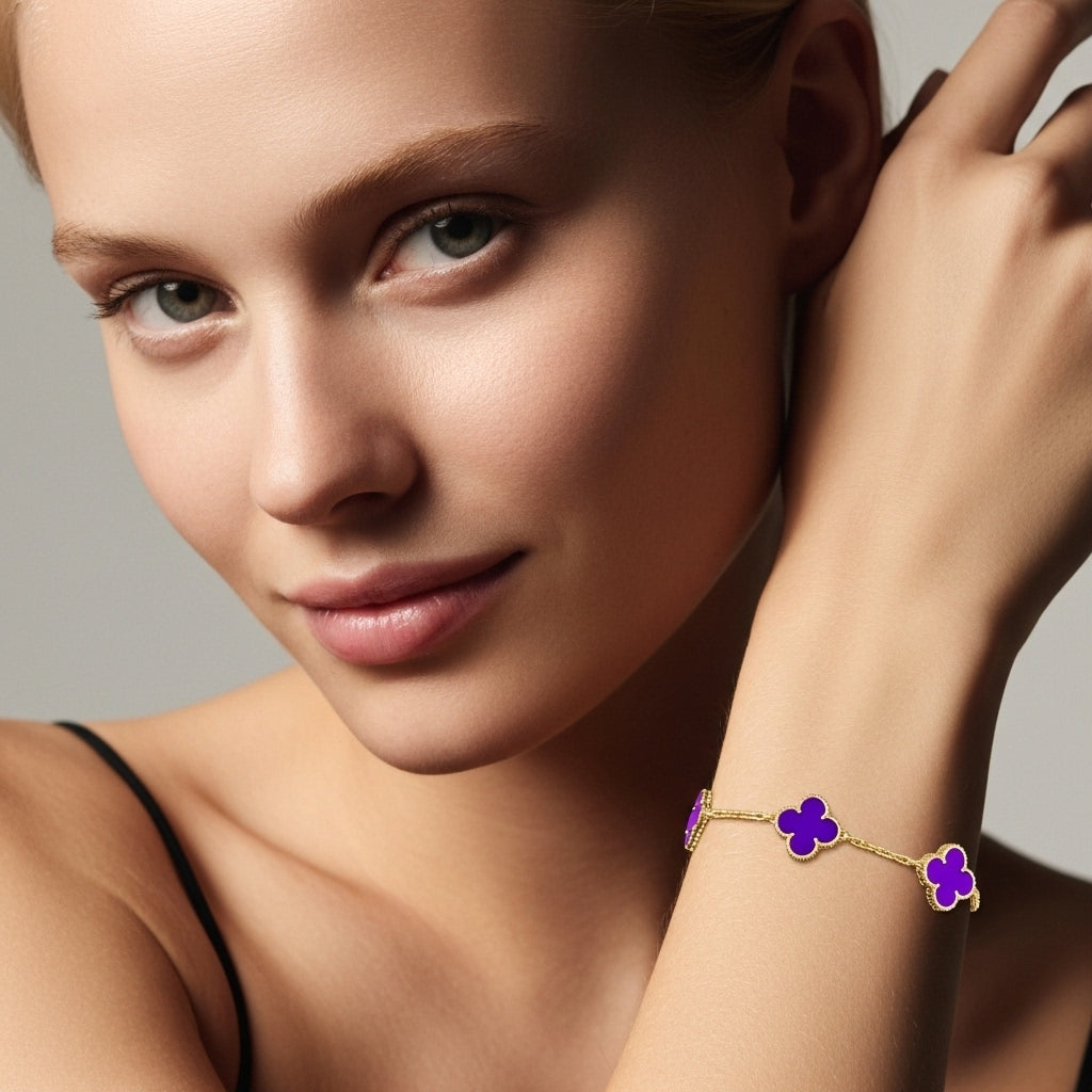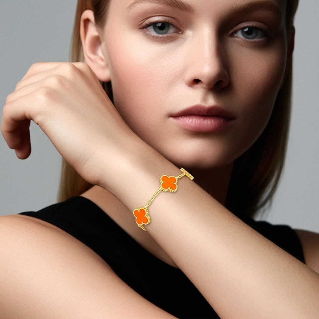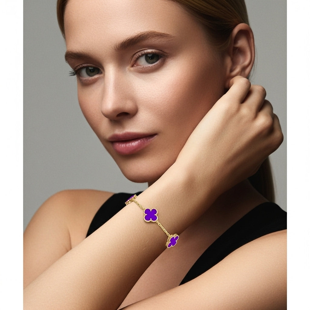 İkonik dört yaprak formu ve göz alıcı taşlarıyla bu bileklik, bileğinizde zamansız bir şans amuleti gibi parlar. Her motif, altın tonlu mikrokabartma çerçinin içindeki el kesimi doğal taşa hayat verir; kusursuz cilası ve boncuk dokulu kenar işçiliği ışığı her açıdan yakalayıp yansıtarak bilek hattında adeta minyatür bir vitrin oluşturur.