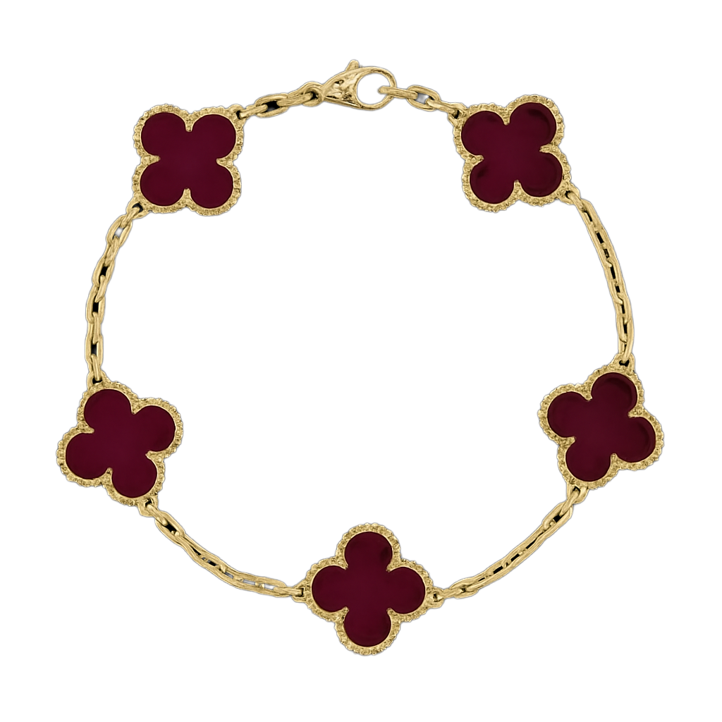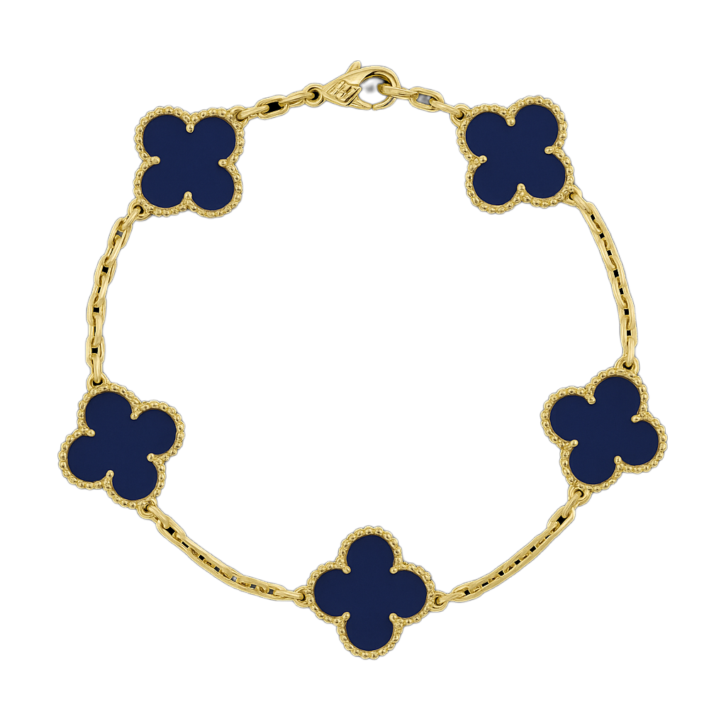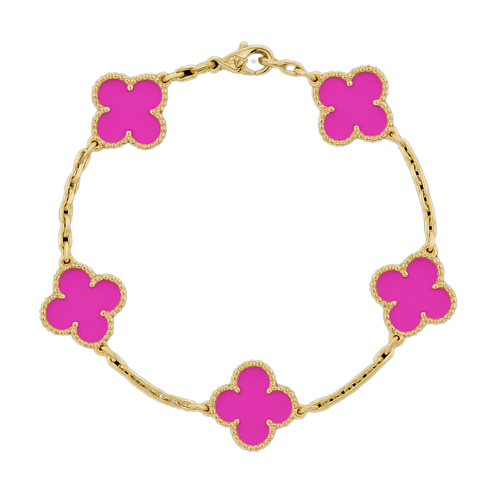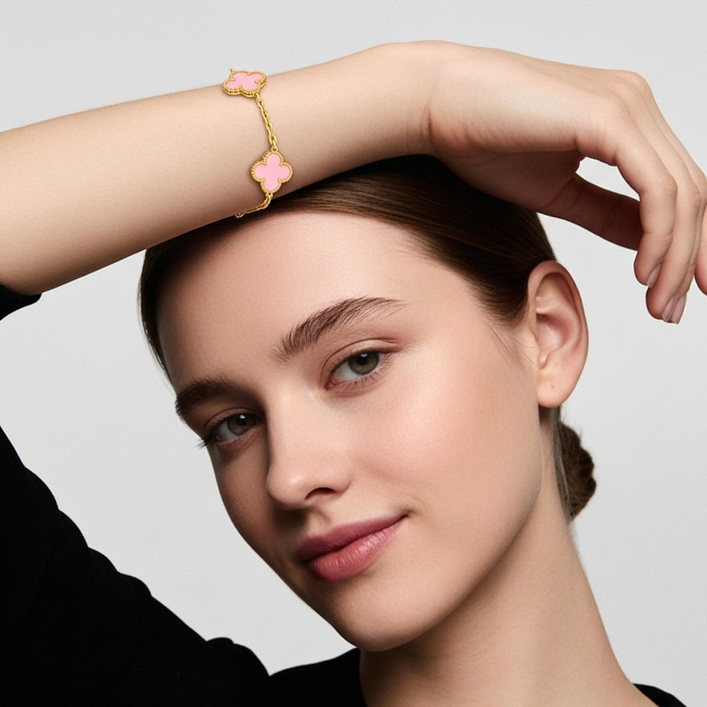 İkonik dört yaprak formu ve göz alıcı taşlarıyla bu bileklik, bileğinizde zamansız bir şans amuleti gibi parlar. Her motif, altın tonlu mikrokabartma çerçinin içindeki el kesimi doğal taşa hayat verir; kusursuz cilası ve boncuk dokulu kenar işçiliği ışığı her açıdan yakalayıp yansıtarak bilek hattında adeta minyatür bir vitrin oluşturur.
