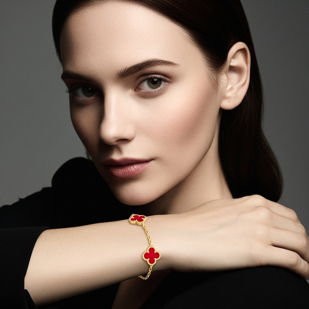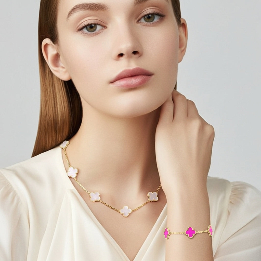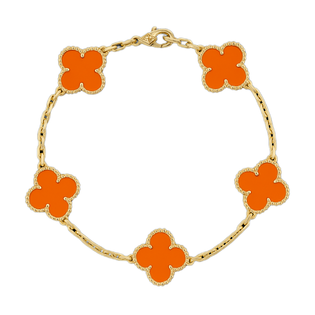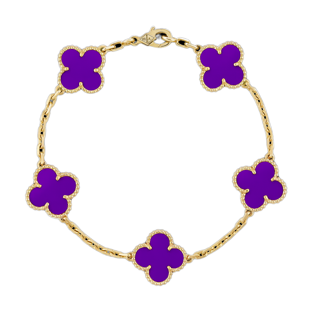 İkonik dört yaprak formu ve göz alıcı taşlarıyla bu bileklik, bileğinizde zamansız bir şans amuleti gibi parlar. Her motif, altın tonlu mikrokabartma çerçinin içindeki el kesimi doğal taşa hayat verir; kusursuz cilası ve boncuk dokulu kenar işçiliği ışığı her açıdan yakalayıp yansıtarak bilek hattında adeta minyatür bir vitrin oluşturur.