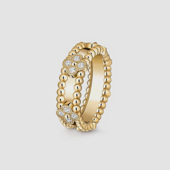 Clover Dot Yüzük, boncuk dokulu bant üzerine yerleştirilen pavé mini yonca başlıklarıyla düzenli bir ritim ve ince bir ışıltı verir. Yuvarlatılmış profil parmakta konforlu oturur, tek başına zarif; diğer bantlarla üst üste kullanıldığında modern bir stack etkisi yaratır. Zamansız ve günlük kullanıma uygun bir imza parça.