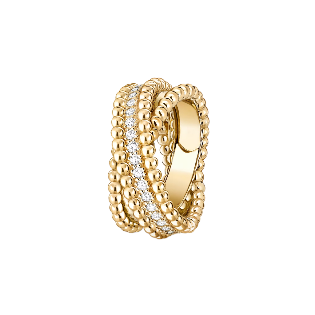 Stack Yüzük, üç adet boncuk dokulu bant ve aralarından geçen parlak pavé hat ile bütünleşik bir katman etkisi verir. Kıvrımlı form parmakta akıcı bir siluet oluşturur, yuvarlatılmış profil gün boyu konfor sağlar. Tek parçada “stack” görünümünü yakalar; minimal stilleri tek dokunuşla yükselten zamansız bir odak parçasıdır.
