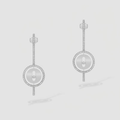 Vector Orbit Küpe, pavé taşlarla çevrelenmiş dairesel bir hale içinde yer alan eliptik “kapsül” ve merkezdeki tek hareketli pırlanta ile ışığı ekseni etrafında döndüren mimari bir siluet sunar. İnce dikey çizgi, formu bir vektör gibi ikiye böler ve modern bir denge hissi yaratır. Parlak beyaz altın görünümü, minimal geometrinin keskinliğini yumuşak ışıltıyla birleştirir; taş her harekette ray üzerinde kayarak canlı bir parıltı üretir. Hafif yapısı gün boyu konfor sağlarken, saç toplu/dağınık her stilde net bir odak etkisi verir. Sessiz lüks, kusursuz simetri: Vector Orbit.