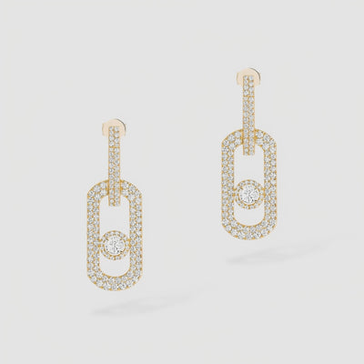 Vega Links Küpe, sarı altının parlak kapsül halkalarını tam pavé ışıltıyla birleştirir; her kapsülün merkezindeki tek pırlanta hareket ettikçe ışığı zincir boyunca kaydırır. Zarif sallantı formu yüzü ince gösterir, hafif yapısı gün boyu konfor sağlar. Tek başına net bir imza, çoklu piercing kombinlerinde ise ritmi yükselten güçlü bir vurgu: gökyüzünün en parlak yıldızına selam niteliğinde, Vega Links.