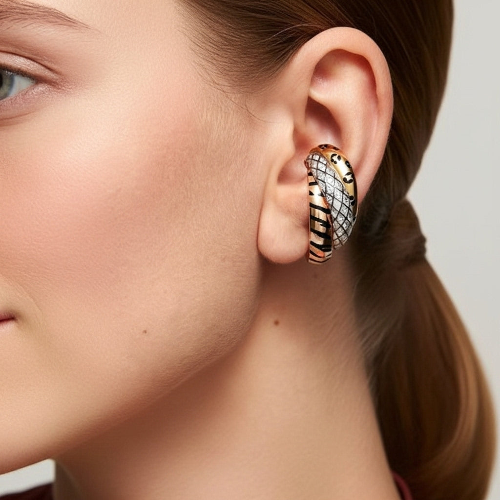 Animalia Fusion Küpe, vahşi dokuları couture bir çizgide birleştirir: leopar ve zebra esintili şeritler pavé kafes bandıyla çapraz akarak kulakta heykelsi bir X-siluet oluşturur. İki tonlu metal parlaklığı ile mikro taşların mozaik ışıltısı, her açıdan güçlü bir kontrast ve net bir odak yaratır. Akıcı kıvrımlar yüz hatlarını çerçeveler; kompakt oranlar yüksek etkiyi yalın bir formda sunar. Sonuç, karakteri yüksek, modern ve koleksiyonda “statement” statüsüne yükselen bir parça: cesur desen, rafine parıltı, tek bakışta tanınan imza.