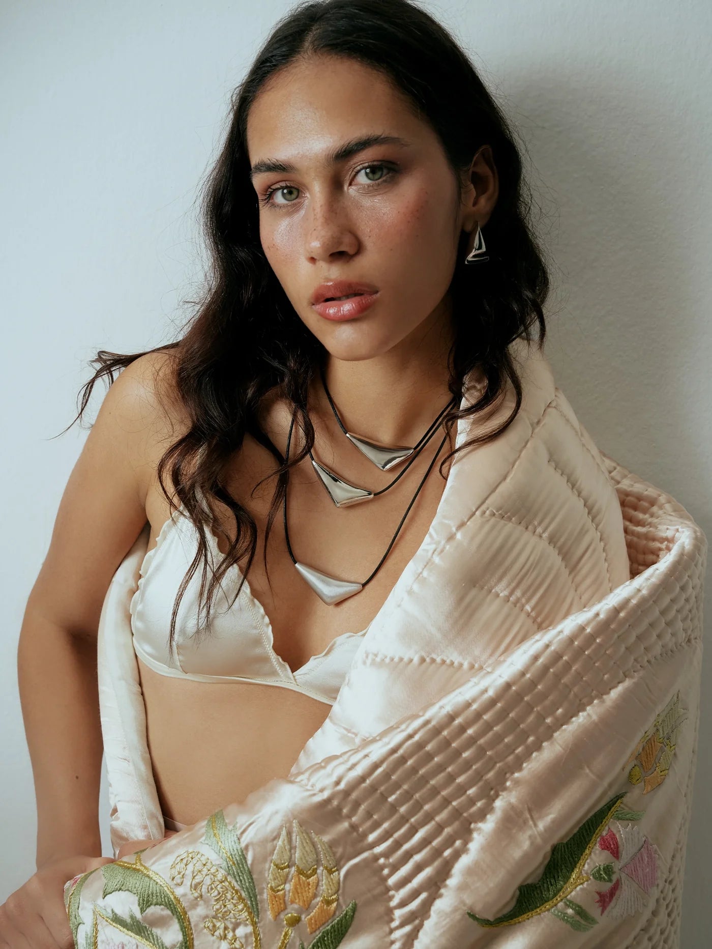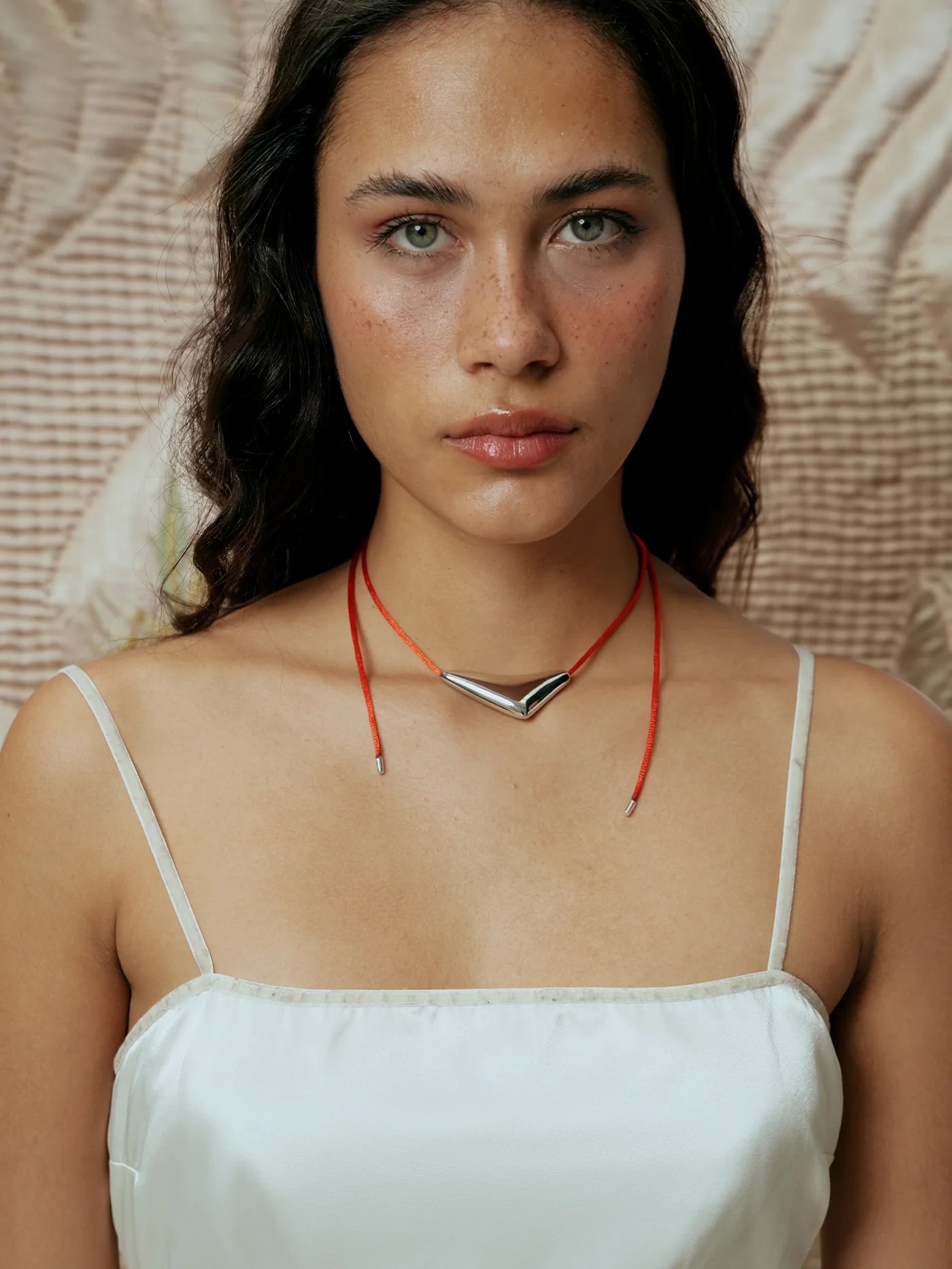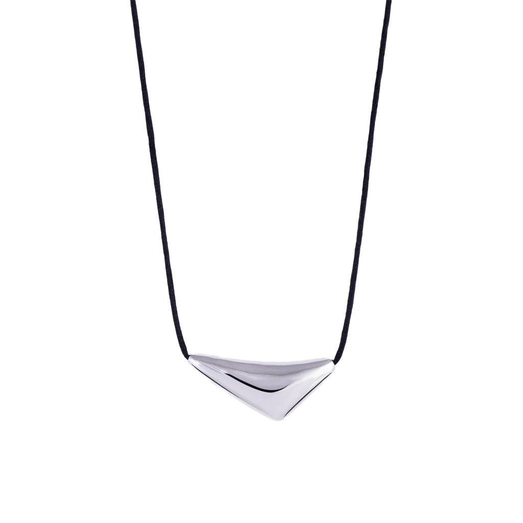 Muskayı hatırlatan yalın V formu, parlak metal yüzeyle birleşerek modern bir koruyucu sembole dönüşür. İnce ip üzerinde durduğu için boyunda hafif, minimal ve niyetli görünür. Gösterişsiz lüksü seven, anlam taşıyan ama çağdaş kalan parça arayanlar için.