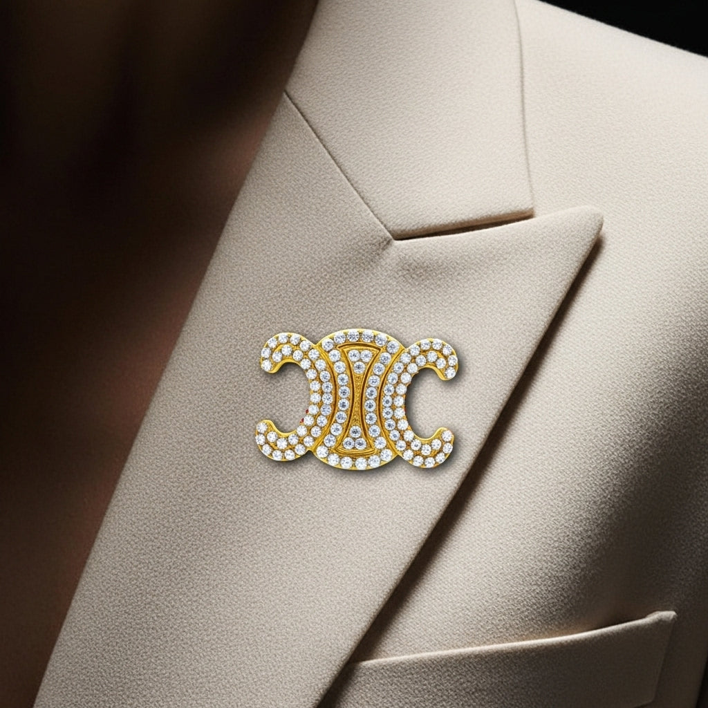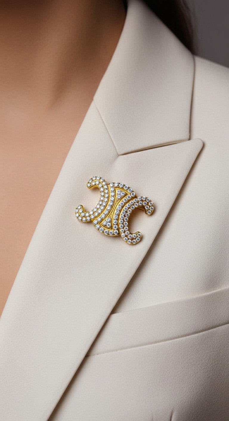 Pavé Atrium Broş, mimariden ilham alan simetrik kıvrımlarıyla ışığı bir avluda toplanır gibi merkezde buluşturur. İkiz hilalin iç hattına yerleşen kademeli pavé, her mikro harekette çizgi çizgi parlayarak formu belirginleştirir; altın tonun sıcaklığıyla birleşen bu berraklık, yakada ve ceket klapesinde ilk bakışta “tamamlanmış” bir siluet yaratır. Fotoğraflarda pürüzsüz okunan parlaklık günlük hayatta da aynı netlikte kalır; beyaz gömlekle sakin ve rafine, siyah-lacivert tonlarla iddialı, ipek elbise omzunda ise sahneyi ele geçiren bir odak etkisi verir. Tasarımın merkezindeki daralan açıklık parçaya nefes aldırır; yoğun ışıltıyı dengeler, broşa hafiflik ve modernlik kazandırır.
