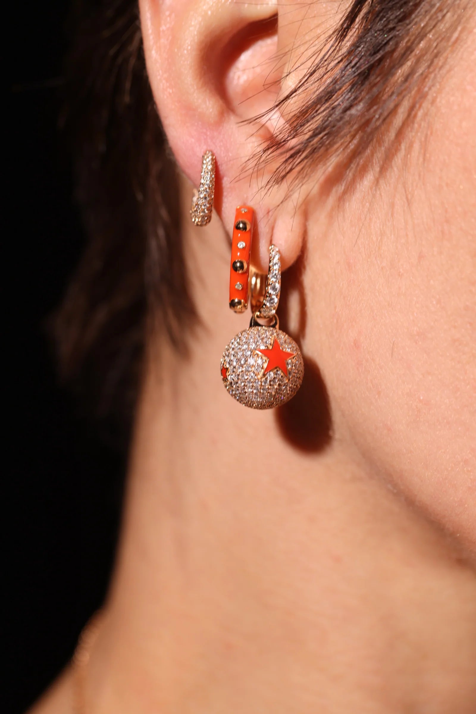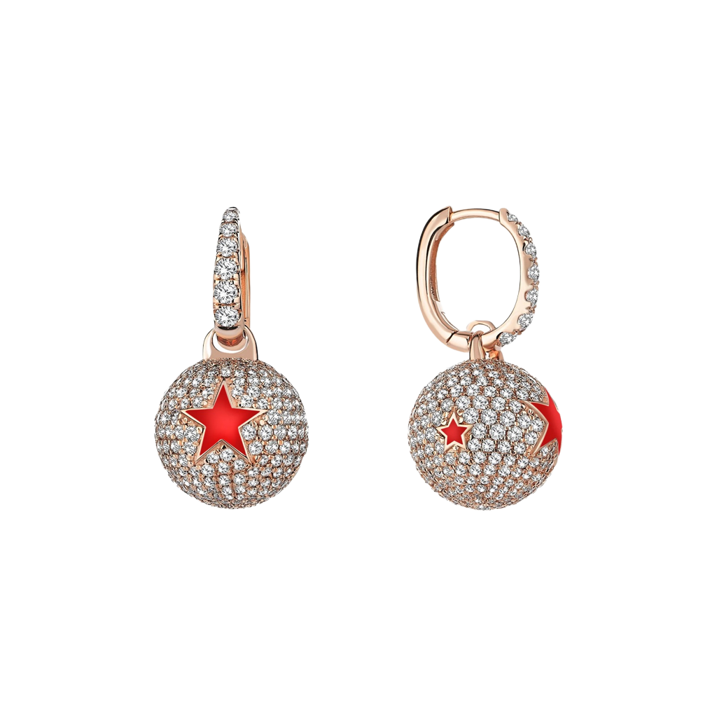 Stardust Pavé Küpe, mikro pavéyle kaplı küresel charm’ların üzerine yerleştirilen parlak kırmızı yıldız kakmalarıyla sahne ışığı etkisi yaratan, yüksek etkili bir tasarımdır. Rose altın tonlu halka gövdeden süzülen küreler, binlerce küçük fasetin oluşturduğu mozaik ışıltıyı tek noktada yoğunlaştırır; yıldız formları yüzeyde keskin bir kesinti yaratıp katman derinliği verir. Kompakt oranlar ve kusursuz parlatma, kulakta net bir siluet ve fotoğrafta güçlü bir kontrast üretir.