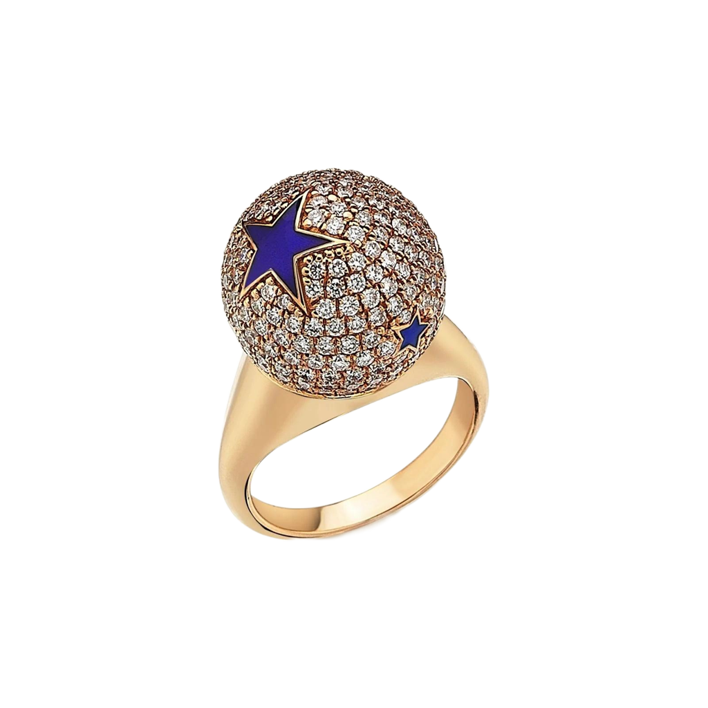 Stellar Indigo Yüzük, kubbe formunda tam pavé kaplı küreyi lacivert yıldız kakmalarıyla birleştirerek tek bakışta “gece göğü” etkisi yaratan heykelsi bir statement sunar. Rose altın tonlu gövde, kusursuz parlatmasıyla ışığı aynaymış gibi taşır; mikro pavé mozaik, yüzey boyunca kesintisiz bir ışıma üretirken indigo yıldızlar bu ışıltıyı keskin kesitlerle bölerek derinlik ve ritim kazandırır. Kubbeyi taşıyan sade şank, hacmi dengeleyen mimari bir taban görevi görür; profil kompakt tutulduğu için parça elde güçlü, çizgide ise şaşırtıcı ölçüde akıcı durur.