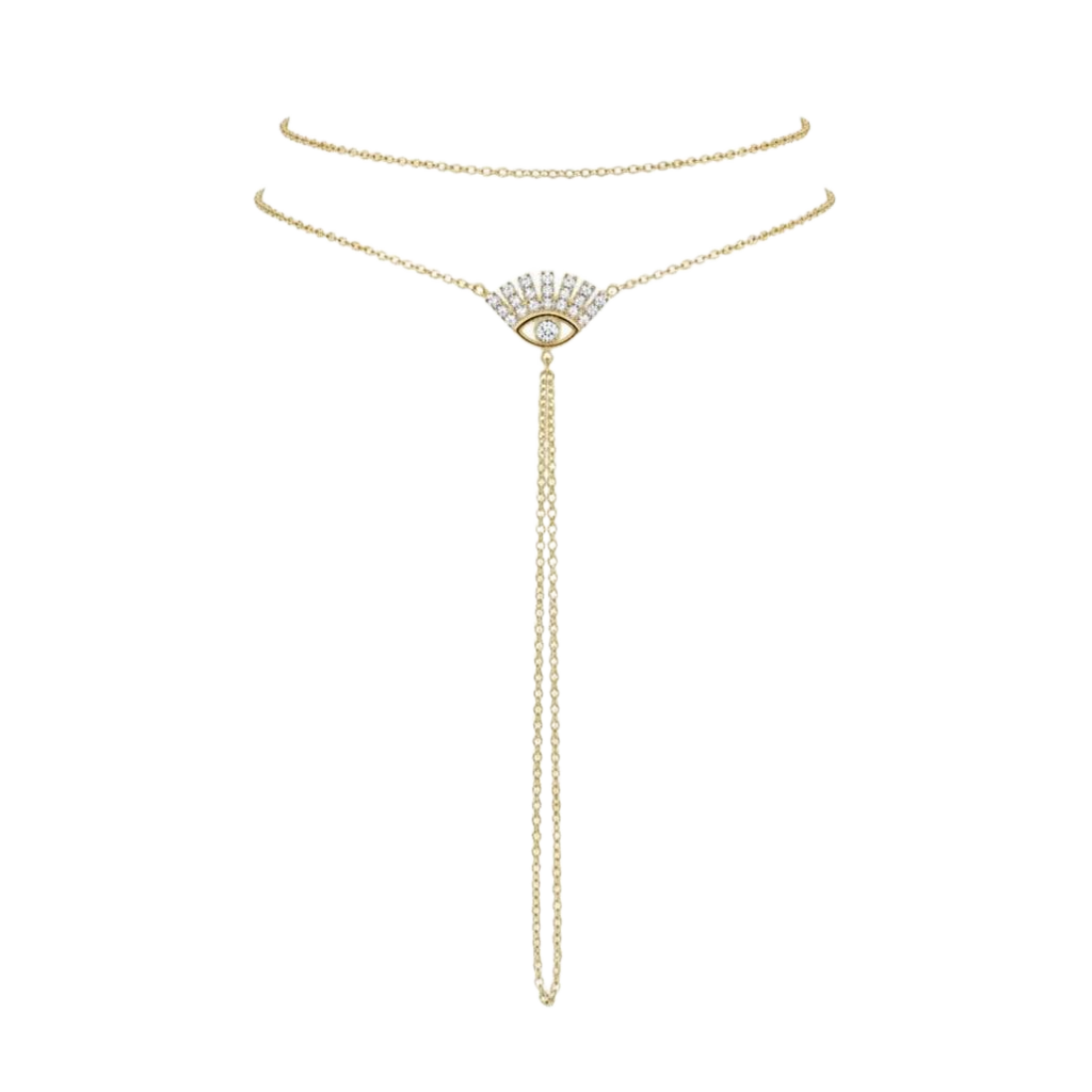 Vigil Pavé Şahmeran, bilekten parmağa uzanan akıcı zincir hattını koruyucu göz siluetiyle birleştirerek elde net ve çağdaş bir odak yaratır. Merkezdeki göz formu mikro pavé taşlarla konturlanır; ortadaki tek taş, ışığı tam merkezde toplar ve çizgiyi kesintisiz bir ışıma hâline getirir. İnce ama kararlı zincir oranları elde zarif bir drape oluşturur; halka bağlantı parmağa konumlandığında form kendiliğinden sabitlenir ve el hareketleriyle birlikte tasarım canlı bir ritim kazanır. Parlak altın ton, pavé dokunun mozaik etkisini yükseltirken negatif alan–ışıltı dengesi modern bir mimari his verir. Sonuç: fotoğrafta güçlü çıkan, gerçek ışıkta daha da etkileyici bir imza parça; sessiz ama uyanık bir “vigil” enerjisiyle görünümü tek hamlede tamamlar.